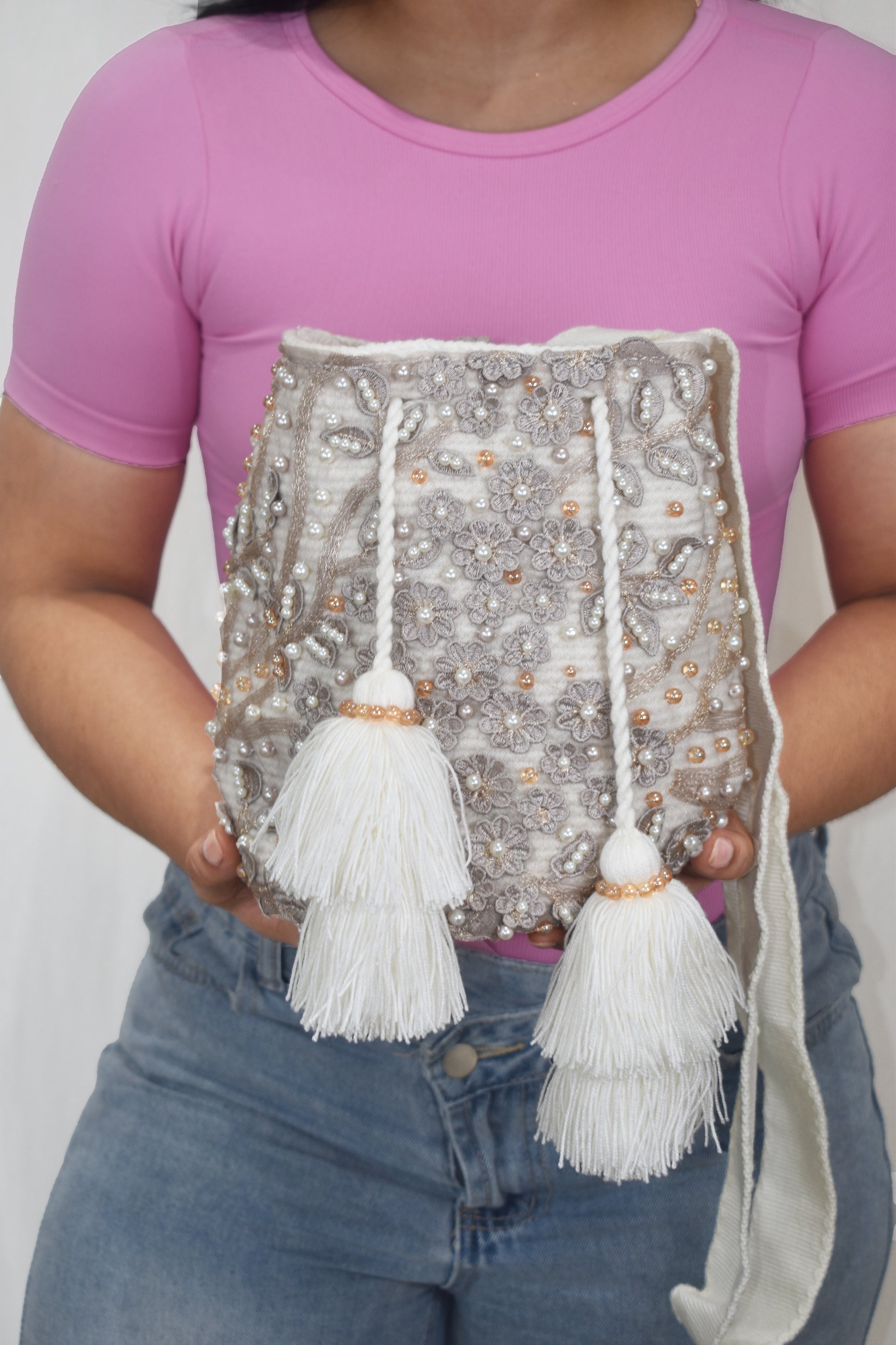 Esta mochila está confeccionada en algodón silvestre tejida por la etnia wayuu, destacándose por su belleza y originalidad gracias a los bordados que adornan su exterior. Los materiales, como encaje, perlas y pedrería, se incorporan de manera individual, garantizando tanto durabilidad como alta calidad. Además, cuenta con un forro interior, combinando funcionalidad y estilo.